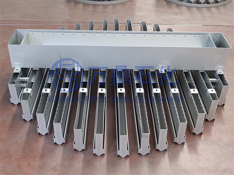 由主槽(一級槽)及分槽(二級槽)組成,主槽置于分槽之上。回流液和加料液體由置于主槽上方的進(jìn)料管進(jìn)入主槽中,再由主槽按比例分配到各分槽中。主槽與分槽的結(jié)構(gòu)尺寸由液體流率、塔件以及對分布質(zhì)量的要求而定。二級槽式分布器結(jié)構(gòu)簡單,易于從人孔中進(jìn)塔組裝;升氣通道均勻,自由截面積大。其缺點(diǎn)是占有塔空間大,且各分槽液位不易達(dá)到完全一致。此種結(jié)構(gòu)形式多用于直徑大于1m的塔中。